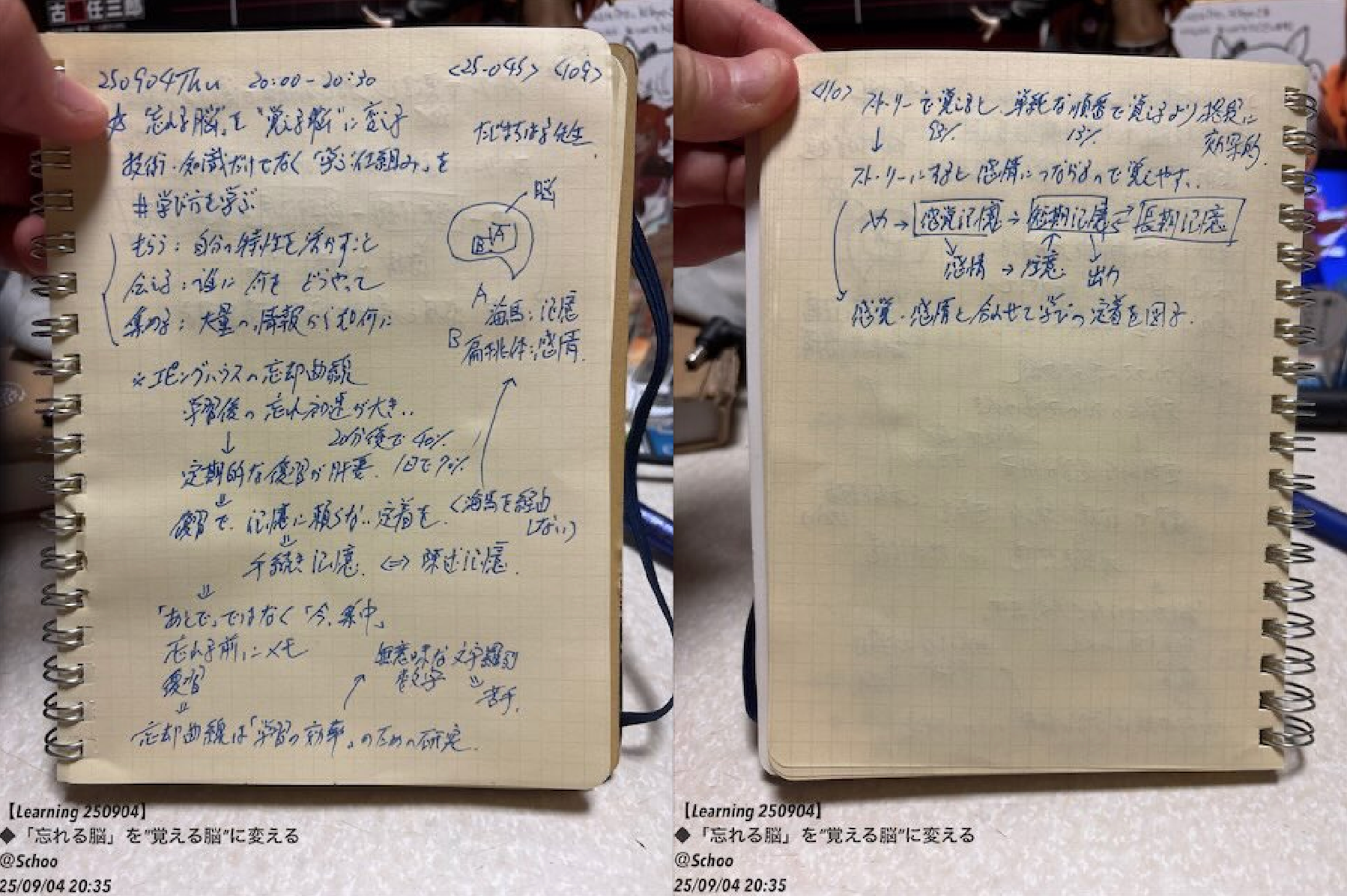 【Learning 250904】 ◆「忘れる脳」を”覚える脳”に変える #Schoo #学び方を学ぶ 受験勉強を全て丸暗記で乗り切った自分ですが、経年劣化には勝てぬ…棒暗記じゃなくて、感情と感覚に結びつけたストーリー記憶への方式転換、そして反復復習。久々のちはるちゃん先生は脳ニット被ってて面白かあいい。 桔梗屋(kikyo_ya)さん https://x.com/suzuiro/status/1963569550668038263