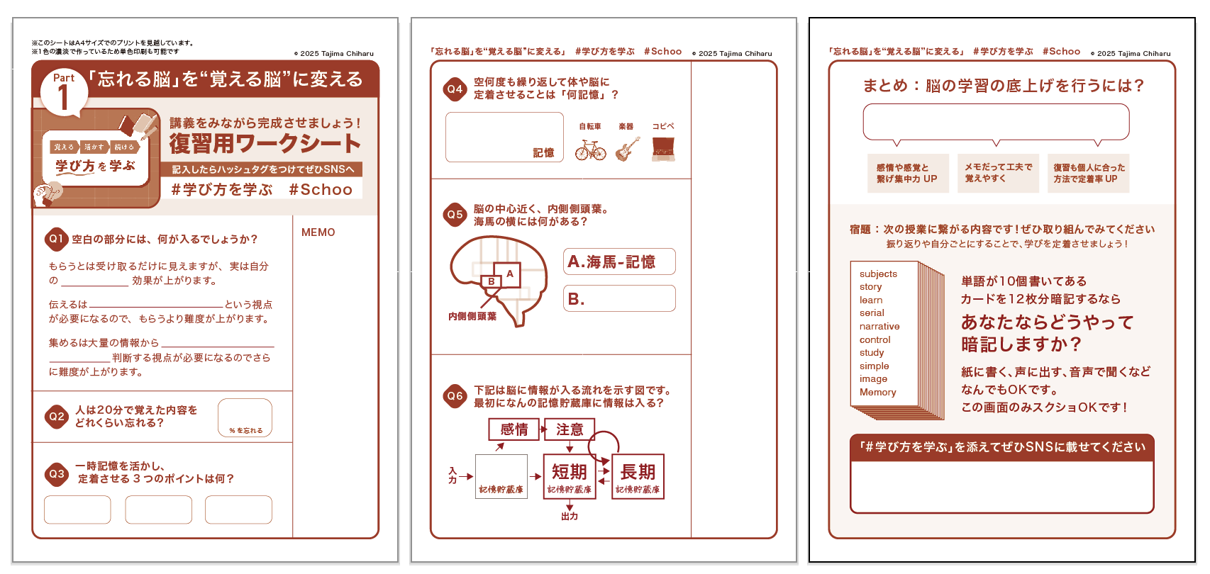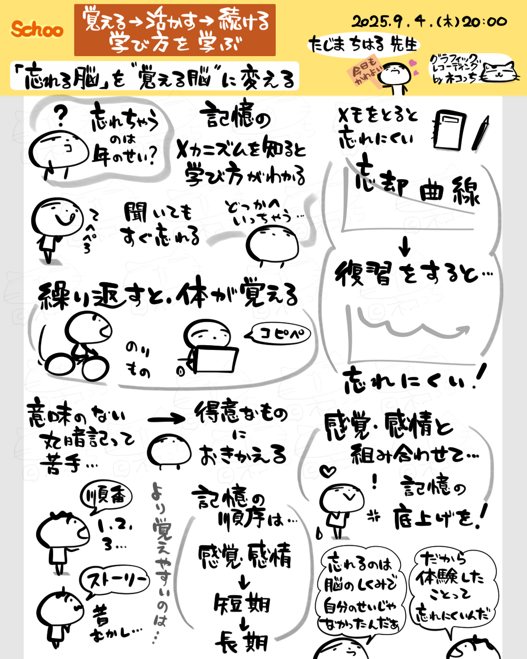 Schoo『覚える→活かす→続ける 学び方を学ぶ(第1回)「忘れる脳」を“覚える脳”に変える』 たじまちはる 先生(ディレクター/デザイナー) ネコっち@イラスト・グラレコさん https://x.com/flytetyme2/status/1963565408235188471